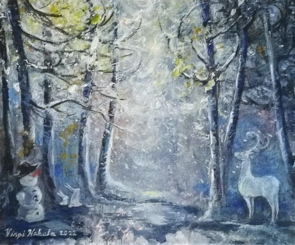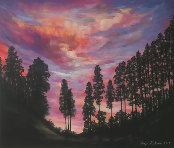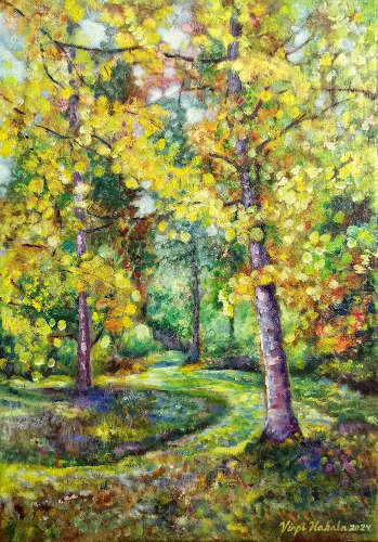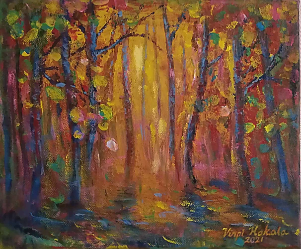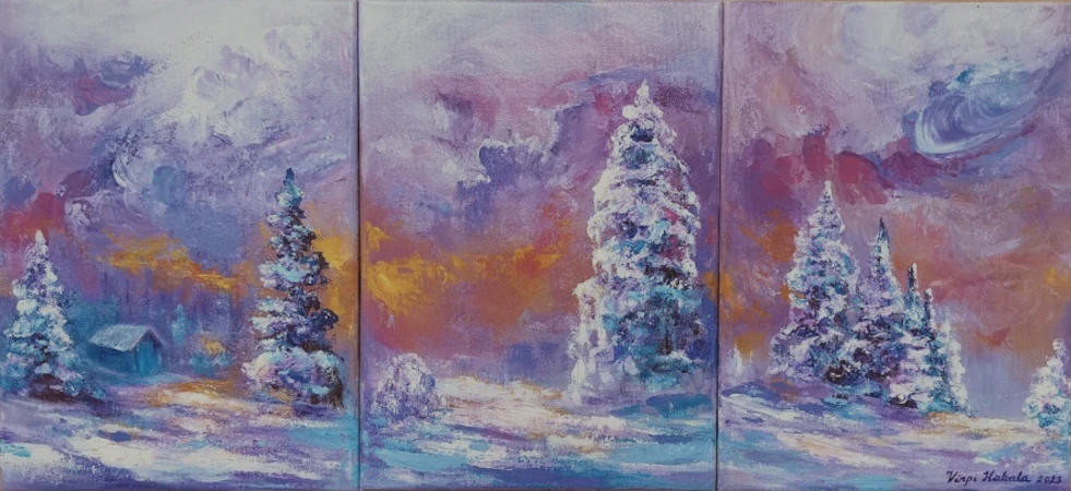 Keltainen syksy, öljy kankaalle, v.2024. Ovi, 20 x 80 cm. Akryyli 3D-pohjalle, v. 2024. Syysjuhla, 45 x 54 cm. Akryyli kankaalle, v. 2023. Punainen pilvi, 40 x 40 cm. Akryyli kankaalle, v.2023. Talven lila, 24 x 33 cm, x kolme. Akryyli kankaalle, v. 2023. Pikkumetsän lumitaika, 25 x 30 cm. Akryyli kankaalle, v.2022. Pikkumetsän kultakylpy, 25 x 30 cm. Akryyli kankaalle, v.2021. Pikkumetsän kevätilta, 25 x 30 cm. Akryyli kankaalle, v.2021. Ilta Tallinnassa, 33 x 60 cm. Akryyli kankaalle, v.2021. Ruskakoivu, 21,5 x 50 cm. Akryyli kovalevylle, v.2020. Kaunis ryteikkö, 30 x 60 cm. Akryyli kankaalle, v.2019. Metsän kevät, 50 x 60 cm. Akryyli kankaalle, v.2020. Talven taikaa, 30 x 40 cm. Akryyli kankaalle, v.2019. Karamellitalvi, 40 x 50 cm. Akryyli kankaalle, v.2019. Kesäyö, 30 x 40 cm. Öljyväri kangaspahvipohjalle, v.2019. Ilta harjulla, 54 x 65 cm. Akryyli kankaalle, v.2019. Vanha metsä, 60 x 80 cm. Akryyli ja öljyväri kankaalle, v.2019. Tammikuu, 40 x 40 cm. Akryyli kankaalle, v.2018. Kuviteltu maa, 30 x 30 cm. Akryyli kangas/puulevylle, v.2018. Pupumetsä, 30 x 30 cm. Akryyli kangaspahvipohjalle, v.2018. Varjoisa puisto 54 x 65 cm. Akryyli kankaalle, v.2018. Koivu ja ensilumi, 40 x 50 cm. Akryyli kankaalle, v. 2018. Rannalla on vain tuuli, 50 x 60 cm. Öljyväri kankaalle, v.2018.